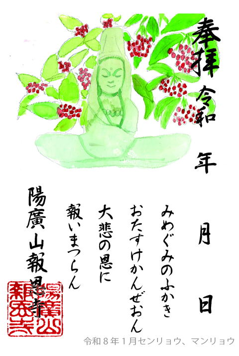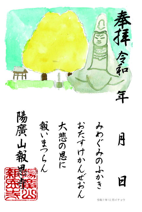 今月の御朱印は、境内の観音石仏とキンモクセイをモチーフに描きました。 |