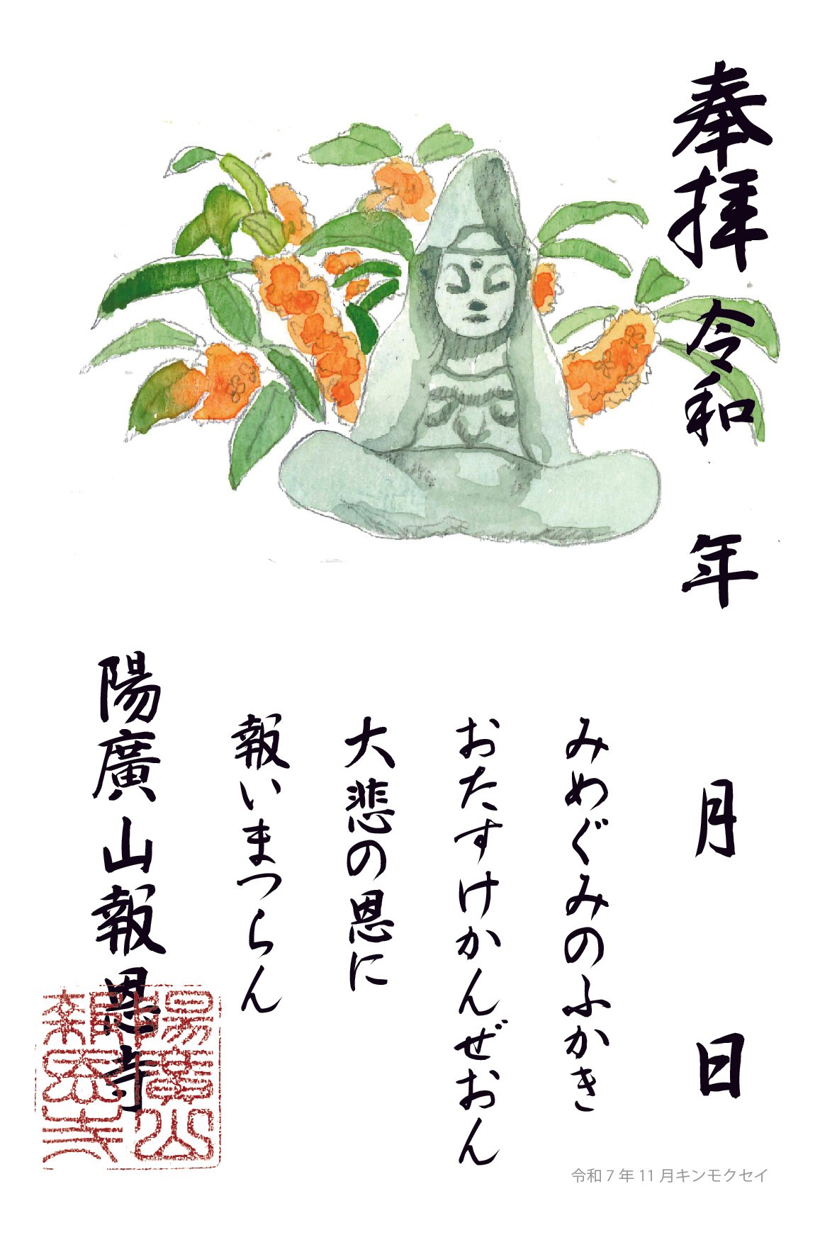 安置されている観音石仏様とともに、その季節の花を描き、さらに「おたすけ観音 報恩寺」の御詠歌を添えております。