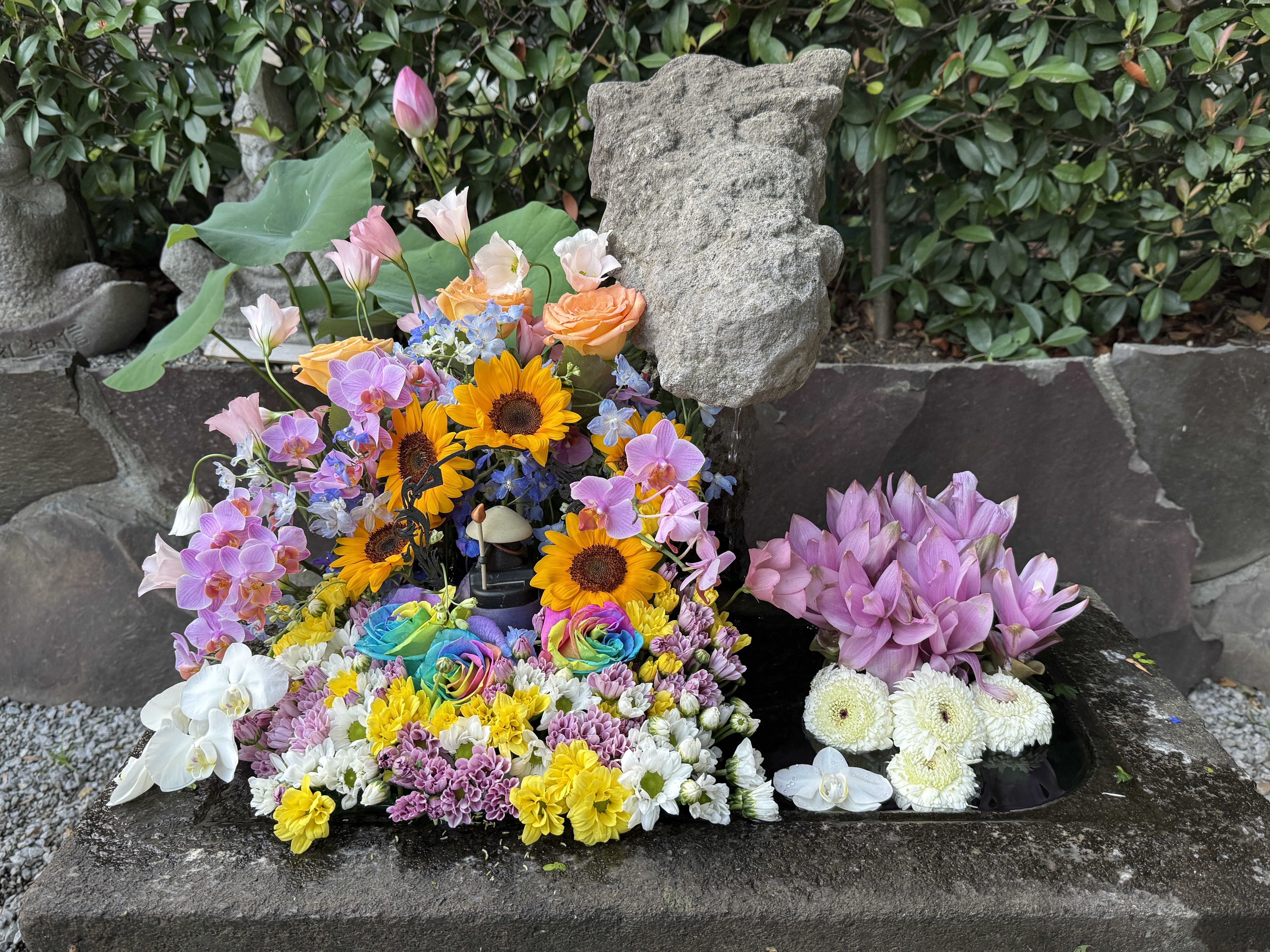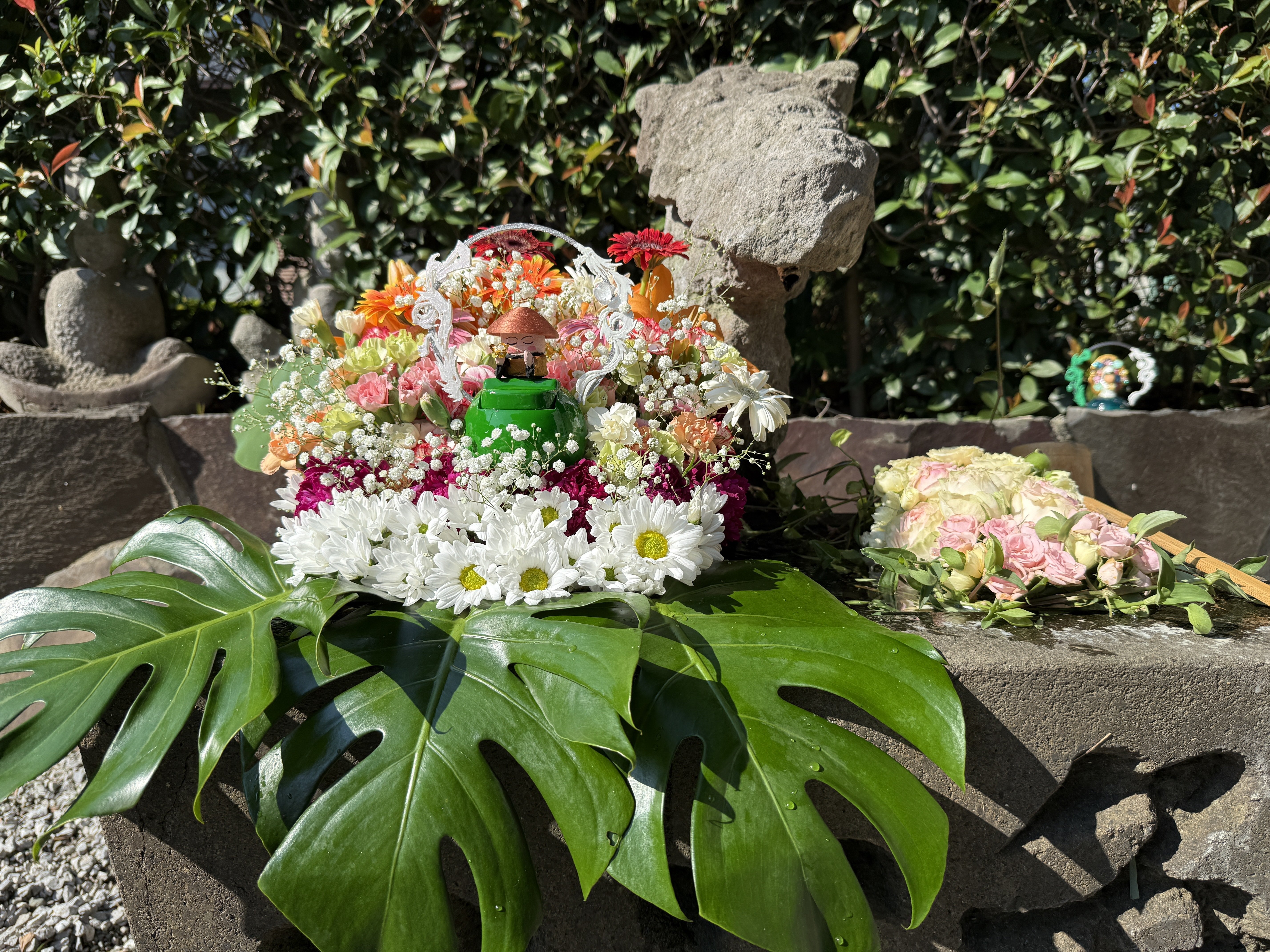 令和7年7月15日![]() ![]() 7月12日(土)の法事で使用したスタンド花を、花手水に再利用いたしました。 質のよいお花ばかりで、想像以上に美しく仕上がり、心和む空間となっております。 どうぞ、お参りの折にご覧くださいませ。 |