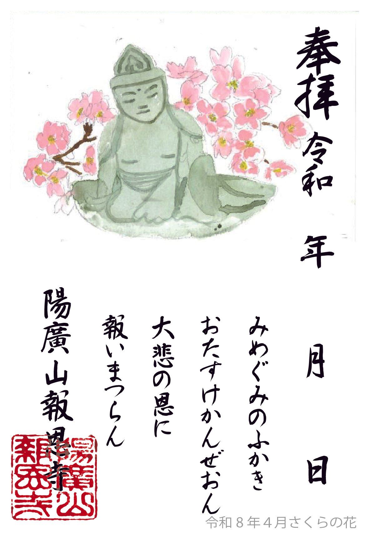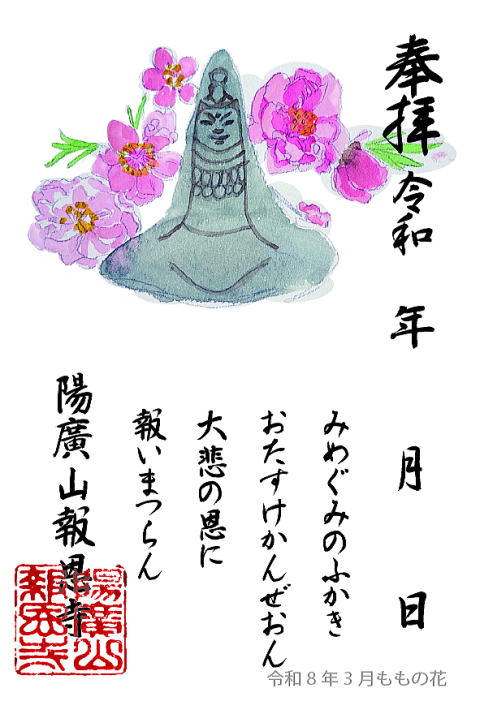 安置されている観音石仏様とともに、その季節の花を描き、さらに「おたすけ観音 報恩寺」の御詠歌を添えております。