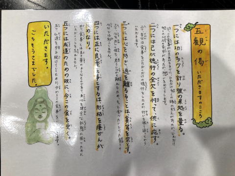 寺っこやカレーをいただくまえに五観の偈を唱えて、いただきますの心と、ごちそうさまの感謝の気持ちでいただきます。 |