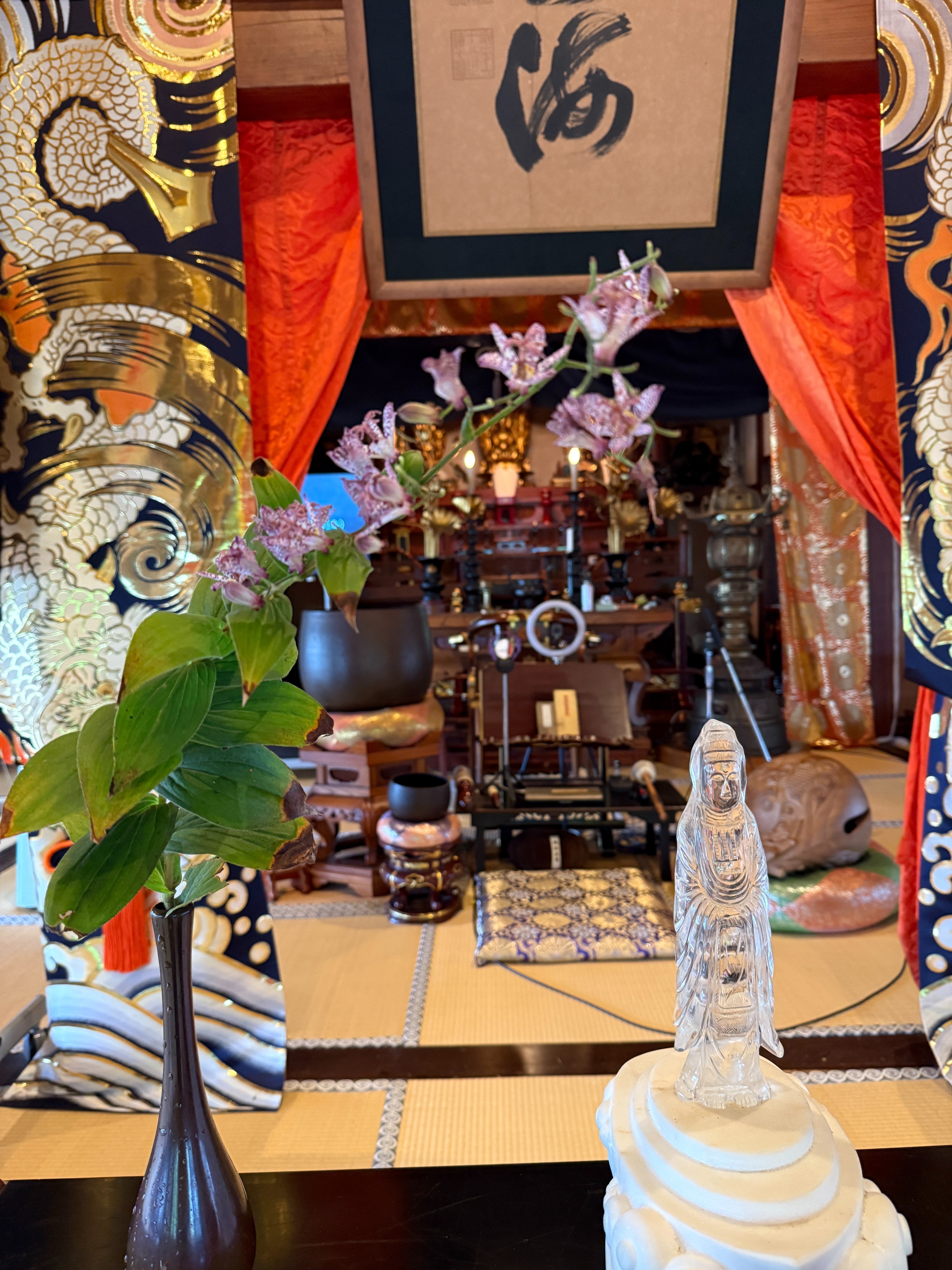 | 令和7年9月6日 ツルボとススキ 今月の坐禅会には、ツルボとススキを取り合わせて活けました。ツルボは秋の訪れを告げるように、小さな星を連ねたような花を穂先に咲かせ、凛とした気配を漂わせます。 本来ならば、ススキの穂が風にそよぎ、秋の野の景を映し出すはずでした。しかし、今年は長引く暑さのせいか、まだ穂が姿を見せてくれません。葉の線だけが静かに空へ伸び、まるで時を待つ心のように感じられます。 未だ見ぬ穂を思いながら、私たちもまた「待つ」ことを学びます。自然の歩みに委ねることは、坐禅に通じる心そのもの。焦らず、ただ今を生きる。 ツルボの淡い紫の花影と、まだ穂をつけぬススキ。その組み合わせは、過ぎ行く夏と、これから訪れる秋との狭間にある「今」を象徴しているようでした。